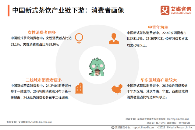 喜茶能够精准把握自己的核心客户群体,在《2022年上半年中国新式茶饮行业发展现状与消费趋势调查分析报告,以喜茶/奈雪品牌为例》的数据显示,新式茶饮的女性消费者居多,占比可达63.1%,消费者以中青年为主,22-40岁的比例可达81.7%。