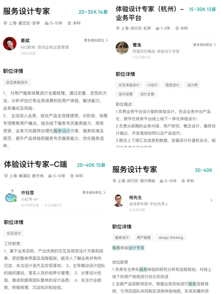 现在企业已经意识到,现在的竞争趋势升级。 不再是手握好产品就能“走遍天下”的时代,服务已成为交付物中最重要、且不可或缺的部分。 产品虽有形但冷冰冰,服务则充满着情感和社交因素。 蔚来、阿里、小红书、途虎养车网都有非常明确的“服务设计专家”需求。