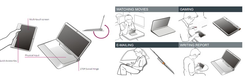 “Business Crossover” is designed to suit the heavy users’ habit of using the same digital device for work and play purposes. The concept features an innovative hinge design that enables the multi-touch display to be angled in different positions for optimized usage experience in various scenarios.