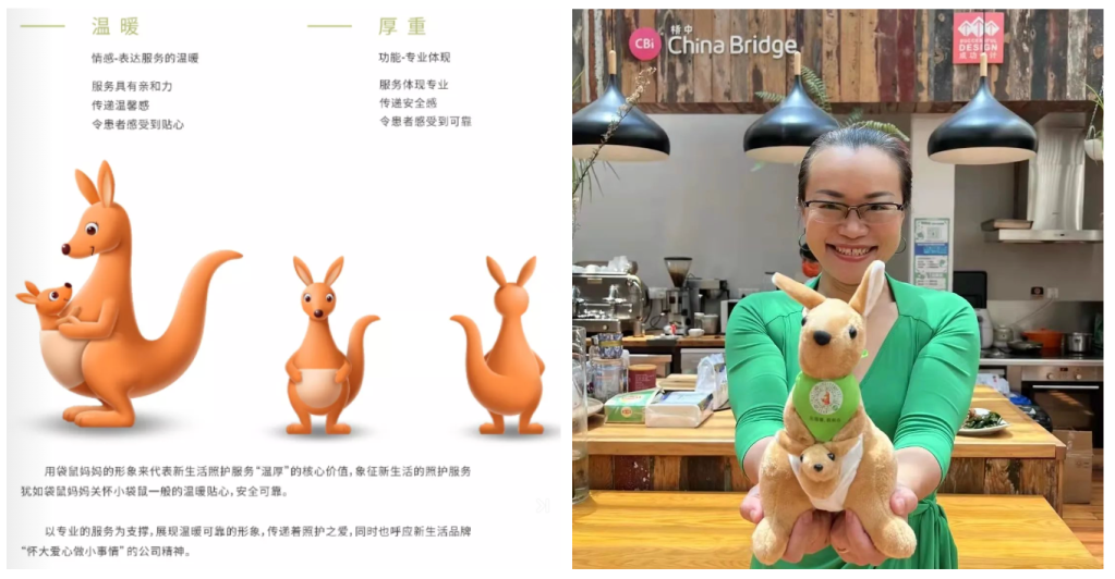 为了让品牌更易辨识、记忆、传播,定义了核心价值关键词“温厚”、吉祥物袋鼠妈妈;新生活的“护工”也不再叫“护工”,而拥有了新的职业称谓“照护师”,这个名称代表的是专业的厚重和服务的温度,更代表了这个职业的价值感和它应当享有的尊重。