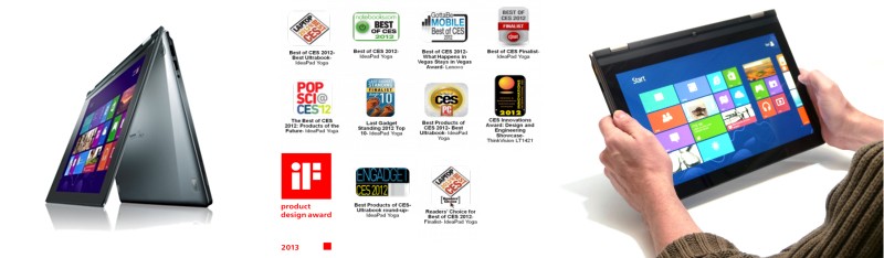 IdeaPad Yoga赢得了业界主流媒体的11项大奖,包括《个人电脑》, 《大众机械》,《笔记本》和《硬件指南》等,都盛赞其开创性的功能性、独特的设计和创新的工程结构。